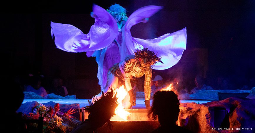 | Unique Show: | "Lu’au Kalamaku" tells a theatrical story rooted in Kauai mythology, featuring characters like Pele the fire goddess and Hiiaka, and culminates with a fire-filled performance showcasing Tahitian rhythms and fire dancing. |