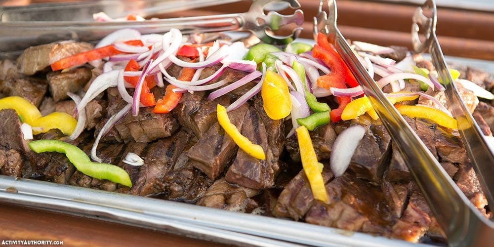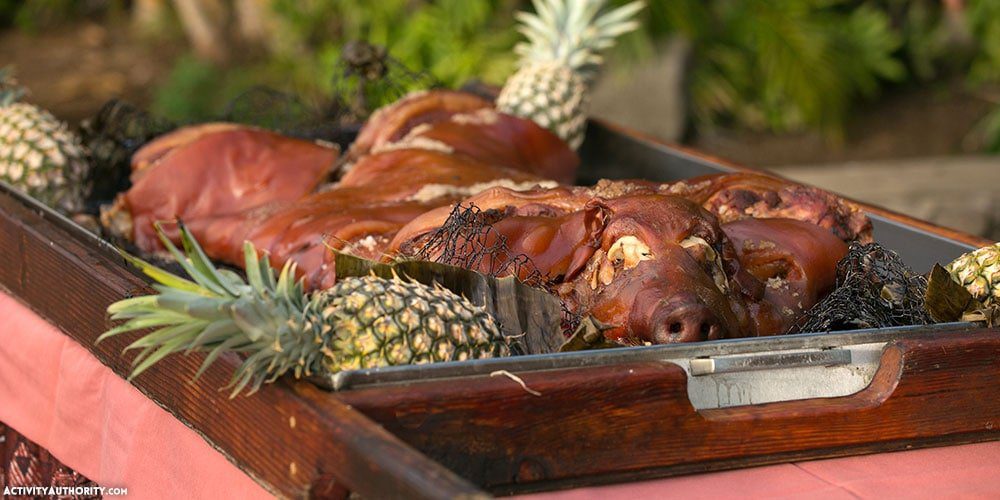 The menu includes various Hawaiian specialties like Imu baked Kalua Pig, Kalbi Short Ribs, Hawaiian Fried Rice, Molokai Sweet Potatoes, Lomi Lomi Salad, Macaroni Salad, Poi, and Coconut Haupia, as well as a wide assortment of worldly cuisine to please each and every guest, including Huli Huli Chicken, Local Mahi-Mahi, Stir-Fried Vegetables, Tossed Kula Greens, Pineapple Coleslaw and several mouthwatering dessert options. Choose from an assortment of blended tropical drinks, and enjoy the show and scenic sunset from your seat!