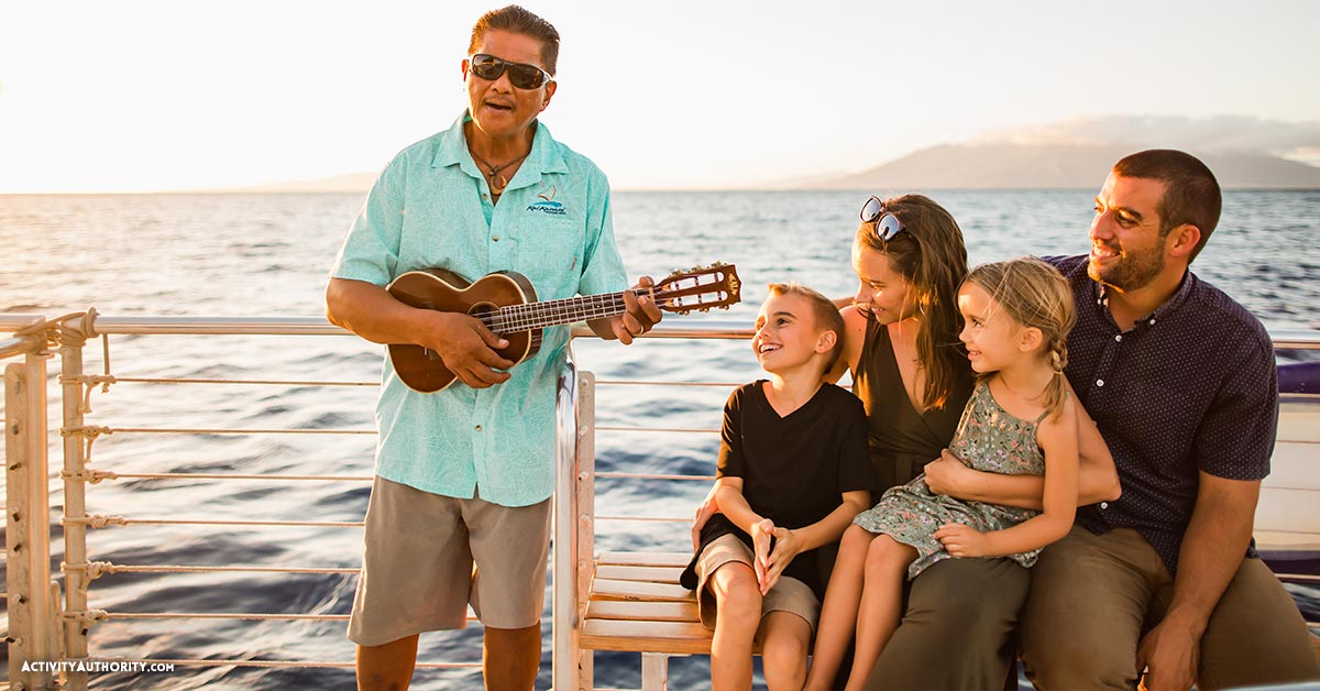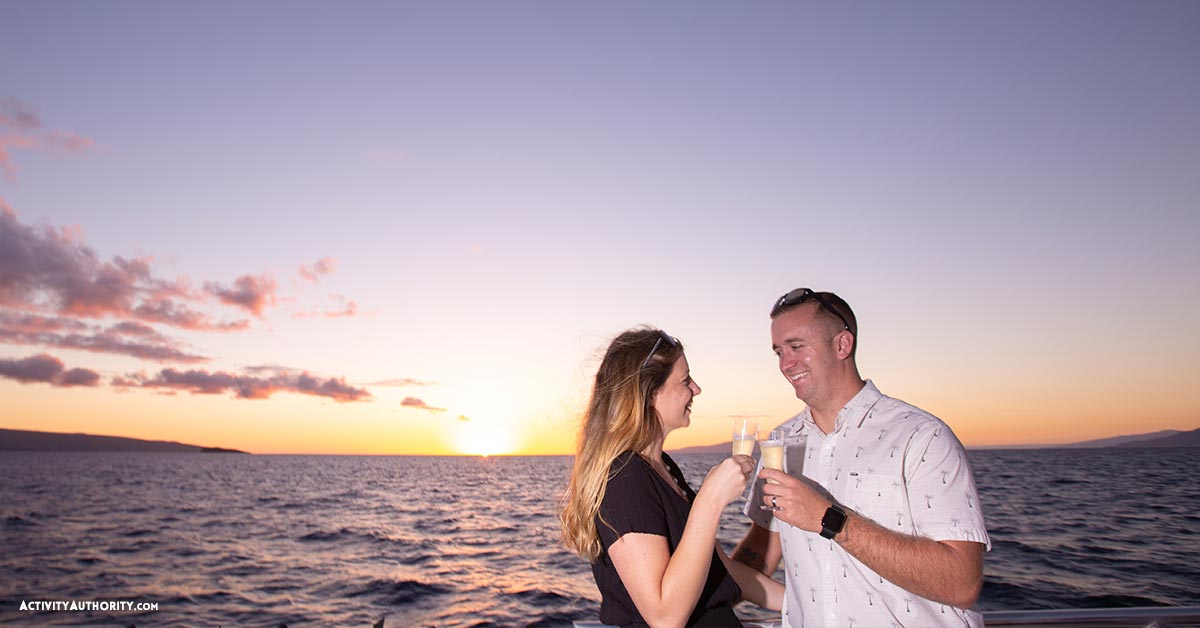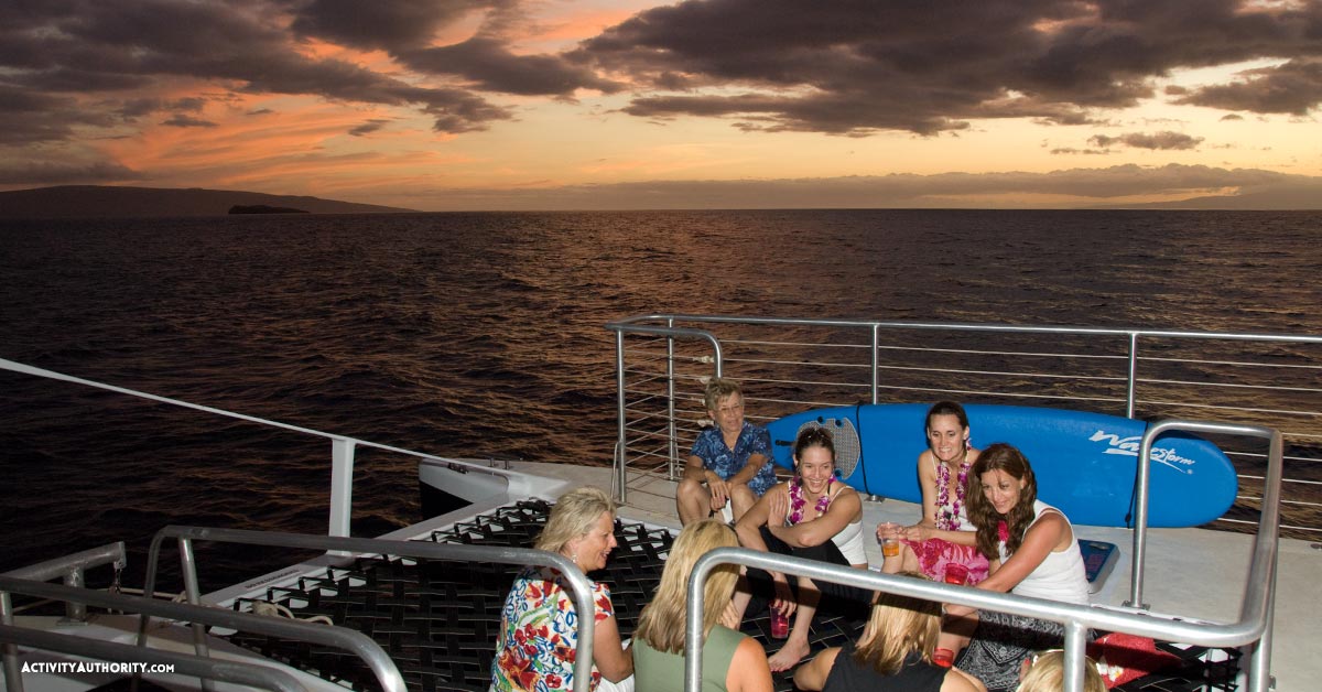 With direct views of the stunning Maui sunset, as well as Molokini Crater, the neighboring island of Kahoʻolawe, Haleakala Volcano, and the white sand beaches and turquoise waters of Makena, this tour is an excellent way to spend a romantic outing with a loved one, a fun evening experience with friends, or night out with the girls. Featuring live ukulele styling from local musician Dwight Quenga, you may also get lucky enough to spot local marine life, such as Hawaiian Spinner Dolphins, Hawaiian Green Sea Turtles, humpback whales, and more.