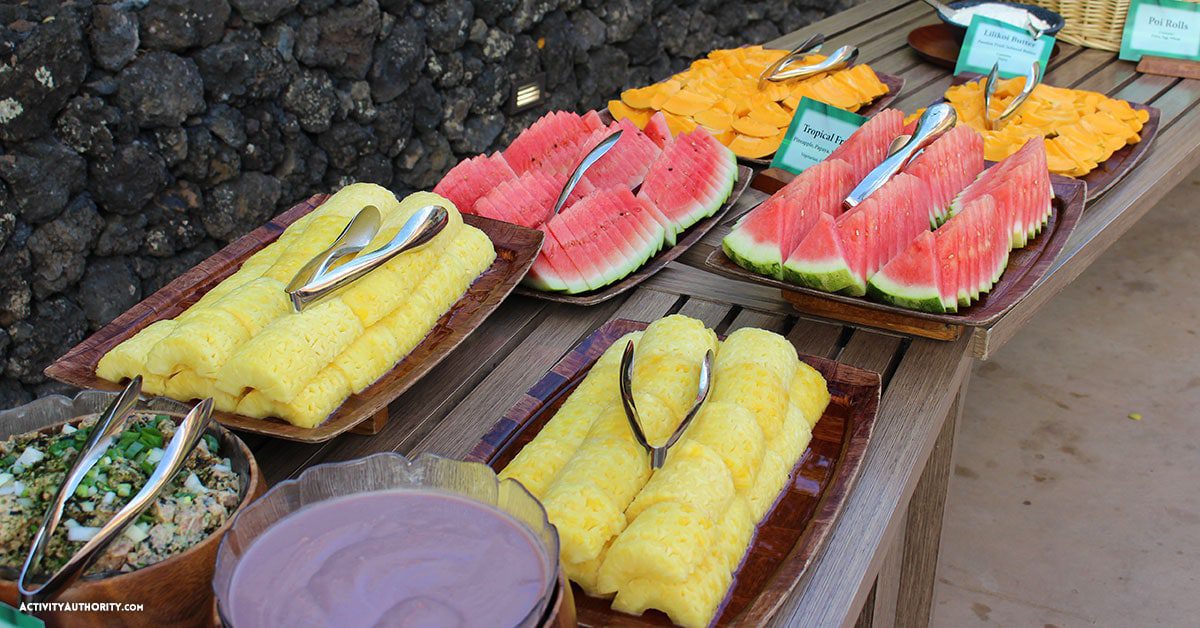Arrive and have your photo taken along the scenic beach walk, and enjoy a wide selection of food, including Kalua Pork, Huli Huli Chicken, Island Fish, Polynesian Rice, Makamaka, Molokai Purple Sweet Potatoes, Creamed Taro Leaf, Seasonal Vegetables, Fruits, Maui Onions, Lomi Lomi Salmon, Ahi Poke, Poi, Salad, Noodle Salad and Taro Rolls with Whipped Lilikoi Butter. Yum! There is also a full dessert bar with specialties like the Chocolate Macadamia Nut Cream Brownie, Pineapple Cake, and more, as well as cocktails, beer, wine, fruit punch, juices, and sodas.