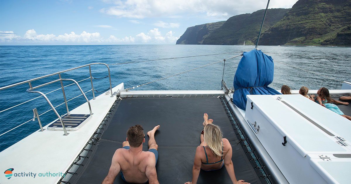 Climb aboard “Leila”, a sleek 50-foot sailing catamaran. This spacious catamaran is 28 feet wide and Coast Guard-certified to take 45 passengers, although tours aboard Leila won’t exceed 37 people to ensure a spacious ride. Onboard, guests will find plenty of dry storage area, as well as plenty of seating and deck space. Leila is also equipped with a waterslide for a fast and fun way to dive into the sea. Leila is also the fastest catamaran in Kauai waters!