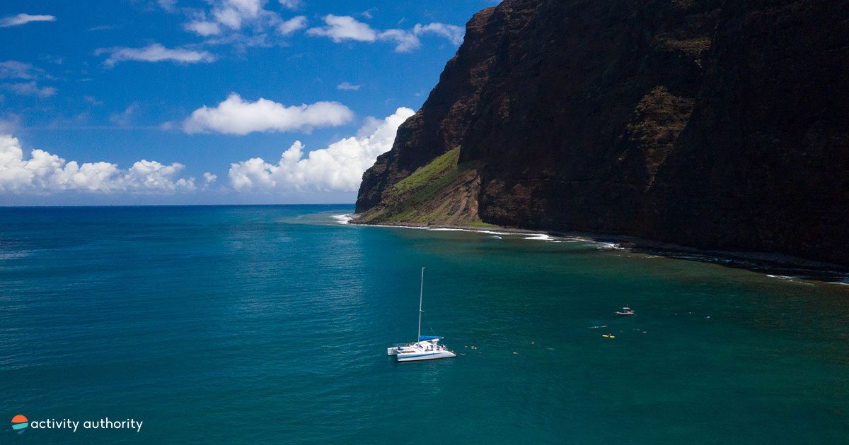 You’ll make your way from Port Allen on the island’s south side and round the corner to the Napali Coast, passing deserted beaches, waterfalls, and sheer sea cliffs along the way. The Napali Coast is one of the most rugged areas in all of Hawaii, only accessible via boat or a multi-day hike, making it an exciting spot for some of the best Kauai snorkeling. Along the way, the crew will delight the guests with stories of the Hawaiian people who once occupied this region.