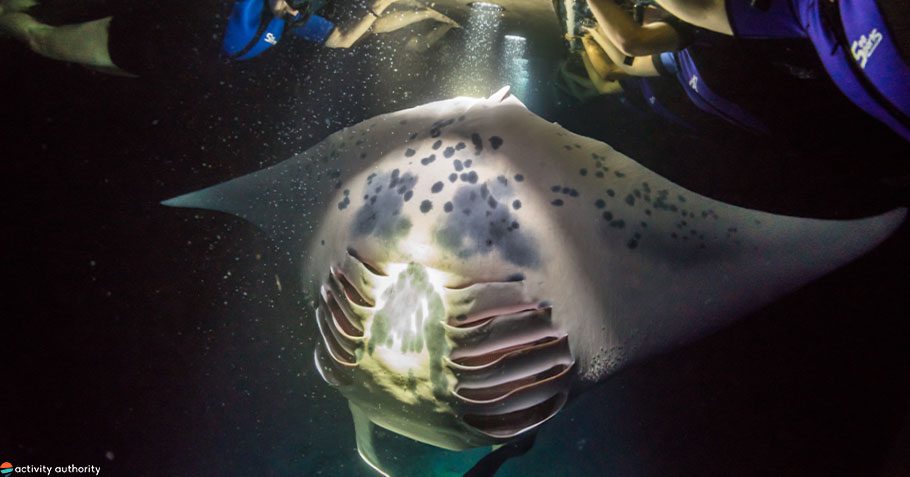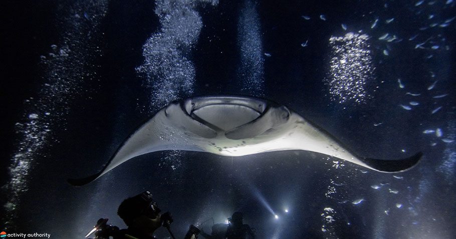 This Kona manta ray snorkel tour is one of the most popular activities on the Big Island. After sunset, immerse yourself in warm Pacific waters for an experience unlike any other- a feeding frenzy among gentle giants. Aboard one of Kona’s most unique tours, guests are shuttled into the night seas for a once-in-a-lifetime chance to swim with graceful manta rays. Once you arrive at your swimming destination outside of Keauhou Bay, spotlights are pointed into the deep to attract plankton, which in turn attract the rays. Accompanied by a Coast Guard-certified crew, guests simply float above these mammoth creatures and watch the unforgettable show.