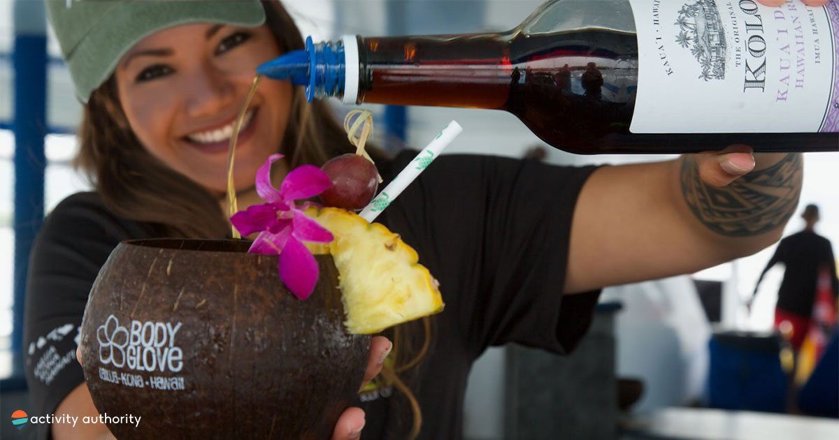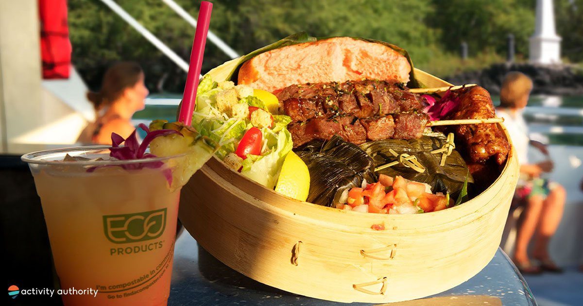 A delectable spread of Hawaiian-inspired food is provided for guests. Dishes served onboard highlight local produce purchased from local organic farmers. Guests will find an array of appetizers, from vegetable crudités and assorted cheeses to lomi ahi tuna dip. Dinner includes traditional and contemporary Hawaiian dishes like kalua pork, coconut ulu (breadfruit) curry, and Hawaiin BBQ chicken. Coconut dinner rolls, vegetable rice pilaf, and assorted salads are also on offer. Vegan, vegetarian, and gluten-free meals are available with 48 hours notice.